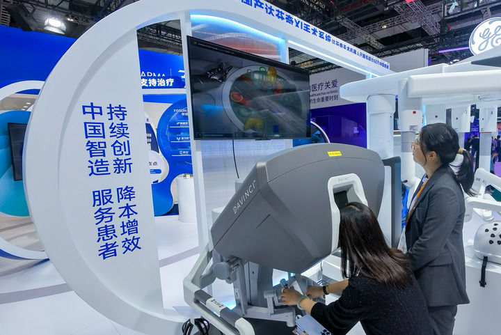 ??11月8日,一名參觀者(左)在第七屆進(jìn)博會(huì)醫(yī)療器械及醫(yī)藥保健展區(qū)復(fù)星醫(yī)藥展臺(tái)體驗(yàn)操作一款外科手術(shù)機(jī)器人。新華社記者 張鋮 攝