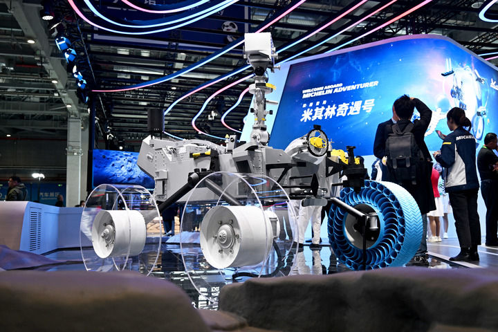 ??這是11月6日在第七屆進(jìn)博會(huì)汽車展區(qū)拍攝的在亞洲首次亮相的米其林月球探測(cè)車輪胎。新華社發(fā)(陳浩明 攝)