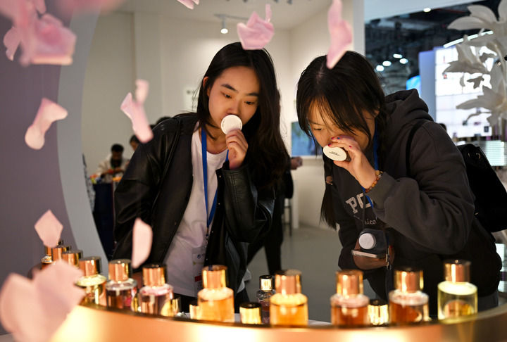 ??11月9日,觀眾在第七屆進(jìn)博會(huì)歐萊雅展臺(tái)試聞香水。新華社發(fā)(陳浩明 攝)