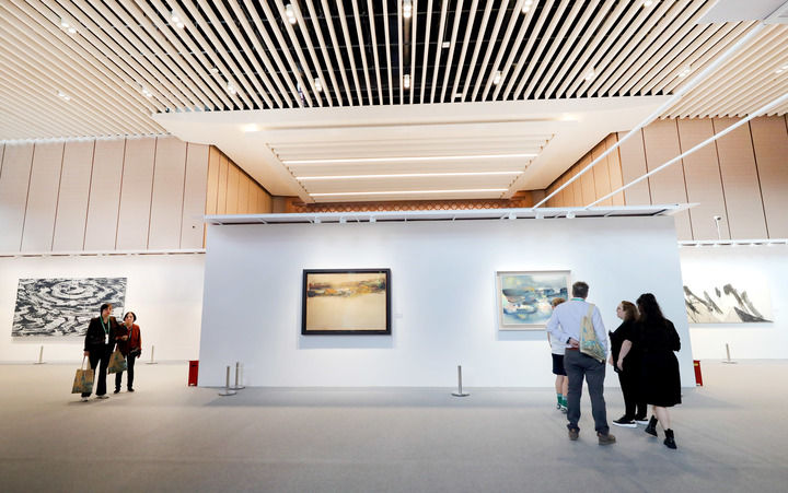 ??11月9日,觀眾在第七屆進(jìn)博會(huì)國(guó)際現(xiàn)當(dāng)代藝術(shù)專區(qū)觀看繪畫藝術(shù)展品。新華社記者 方喆 攝